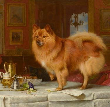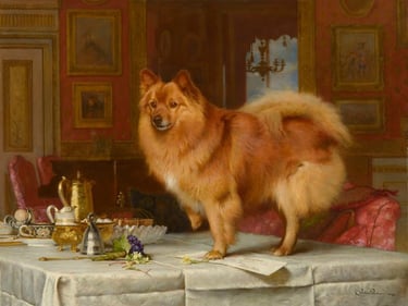 On sait que des spitz oranges ont été offerts au duc de Berry par l'empereur d'Allemagne grâce à un manuscrit enluminé des frères de Limbourg du 15e siècle. Ils sont visibles sur la table.